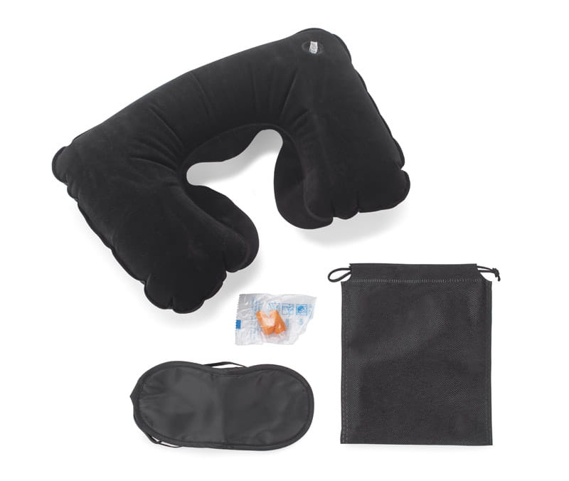 Cestovní sada CINO se skládá ze 3 prvků: masky na oči, 2 kusů špuntů do uší a nafukovacího polštáře, který je potažen příjemným materiálem na dotek. Zabírá málo místa, díky čemuž ji snadno můžeme zabalit do příručního zavazadla. Je lehká a pohodlná na použití. Určitě zpříjemní nejednu cestu. Sada je zabalená v černém sáčku.