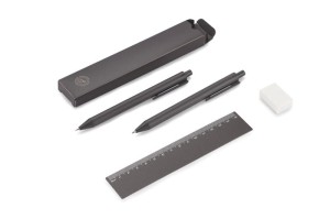 Rozměry produktu: 141 x ⌀ 10 mm (pero); 142 x ⌀ 10 mm (tužka); 165 x 34 x 13 mm (pouzdro); 160 x 30 x 0,6 mm (pravítko)