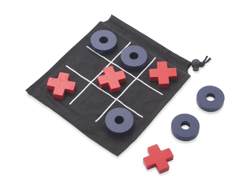 Křížky a kolečka je logická hra hraná dvěma hráči. Je zabalena v černém sáčku, na kterém je potisk herní desky. Produkt malých rozměrů, ideální na cesty.