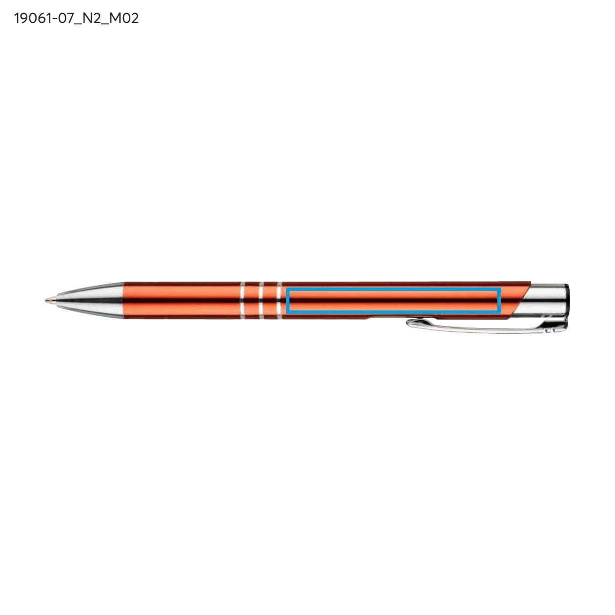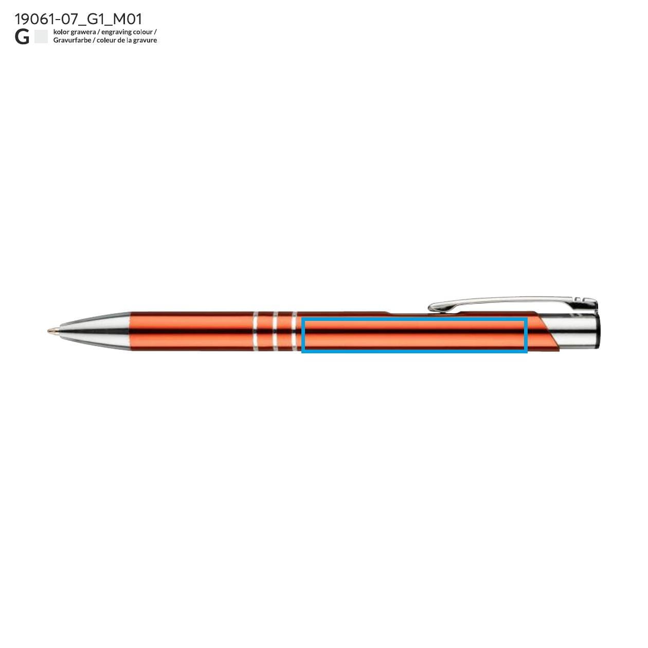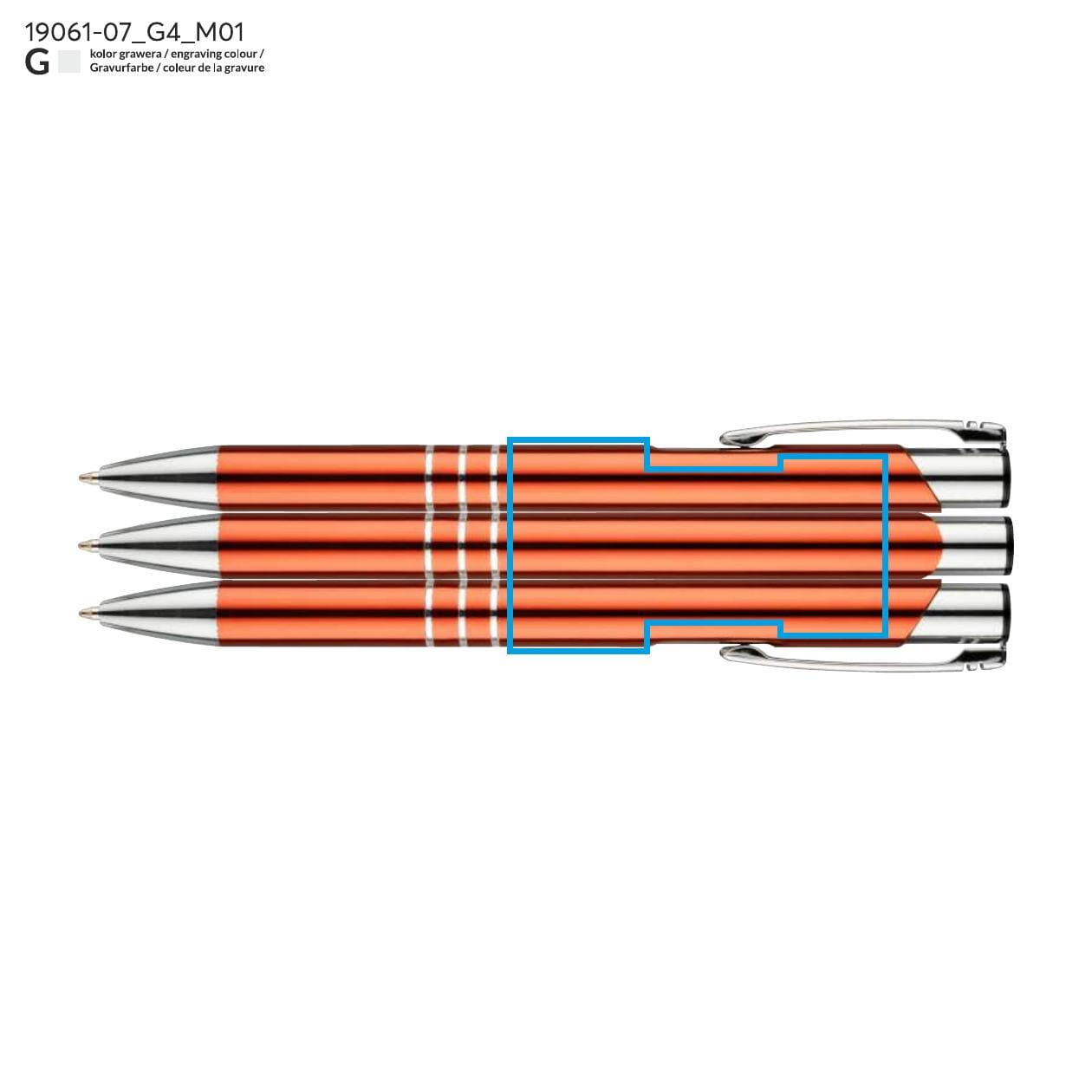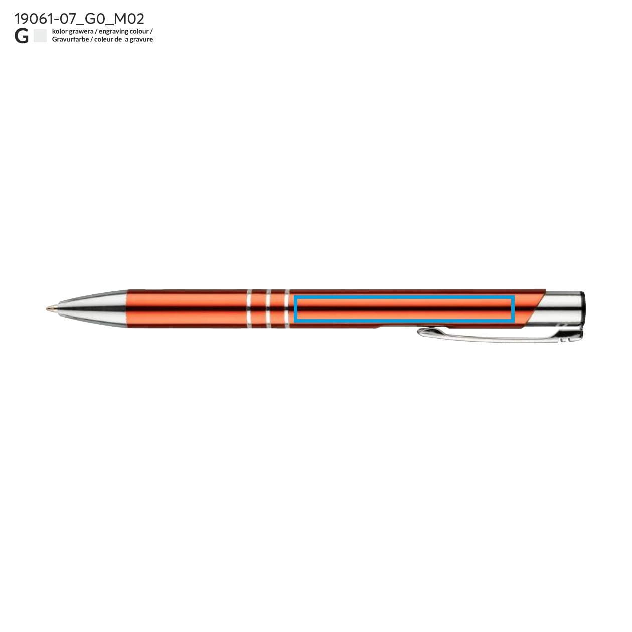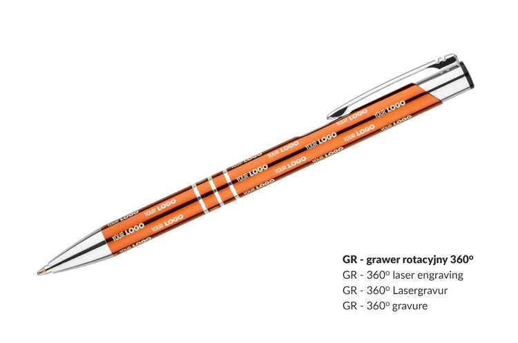 Propiska byla obohacena o tři efektní kroužky, které zdůrazňují její elegantní vzhled a dodávají jí charakter. Oranžová barva ji odlišuje od ostatních kancelářských doplňků, zároveň přitahuje pozornost a může se stát skvělým prvkem vizuální identity vaší firmy. Možnost gravírování loga na povrchu propisky je výborný způsob propagace značky a jejích hodnot, které budou uživateli každodenně k dispozici.