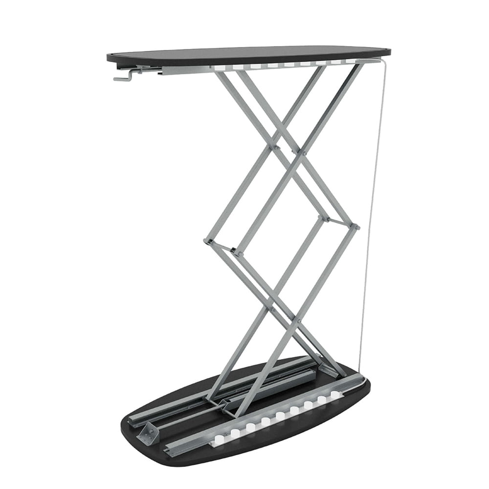 Rám má ocelový nůžkový zdvihák a hliníkový držák. Deska pultu je vyrobena z černé MDF desky o tloušťce 15 mm, navíc dokončená kanálem o průměru 3 mm.